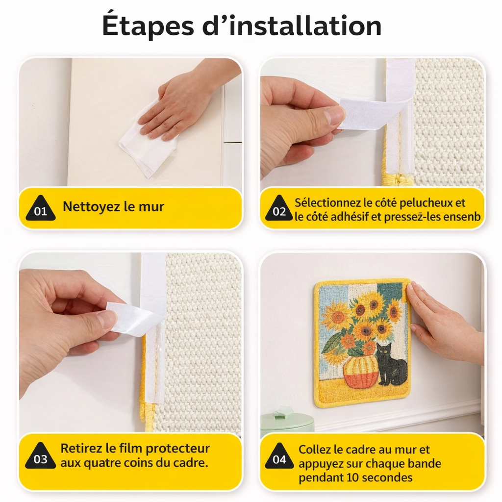 Fixez le griffoir au mur et appuyez fermement sur chaque bande pendant 10 secondes.